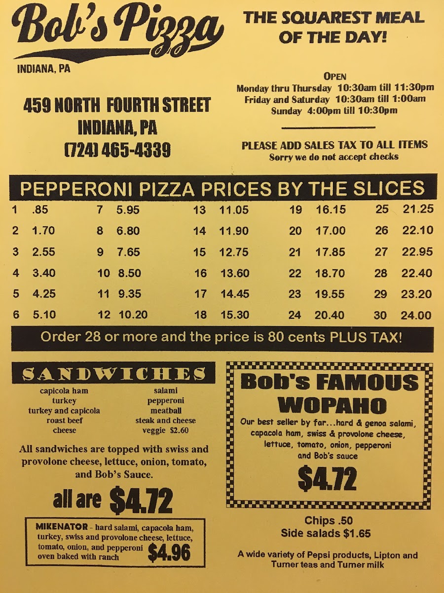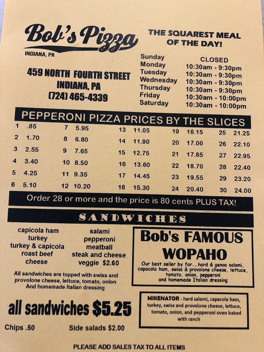 Welcome to Bob's Pizza, a delightful pizza haven located at 459 N 4th St, Indiana, PA. Here, you will find a menu that champions simplicity and comfort, specializing in classic pizzas that never disappoint. Customers rave about the irresistible taste and unbeatable prices, with slices starting at just 85¢.